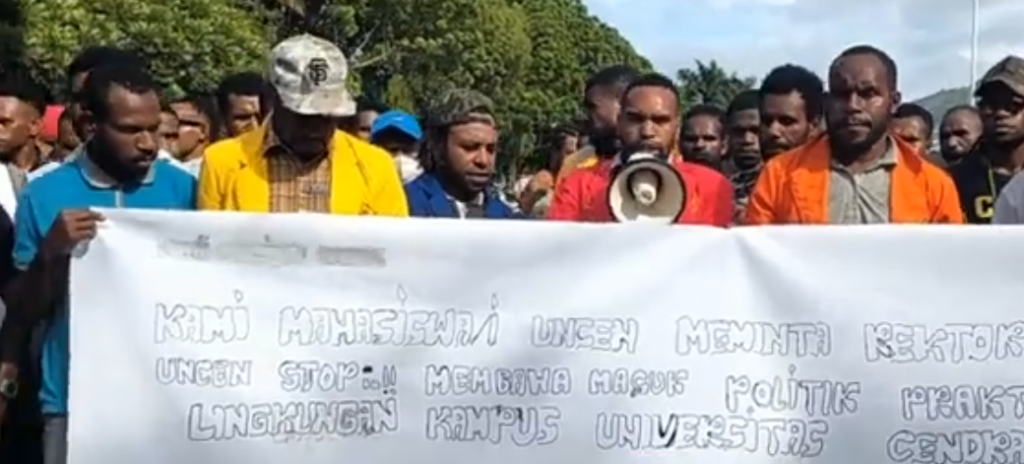Dimana pada spanduk tersebut bertuliskan “Kami Mahasiswa/i Uncen meminta Rektor dan PR-III Uncen Stop membawa masuk politik praktis di Lingkungan Kampus Universitas Cenderawasih.