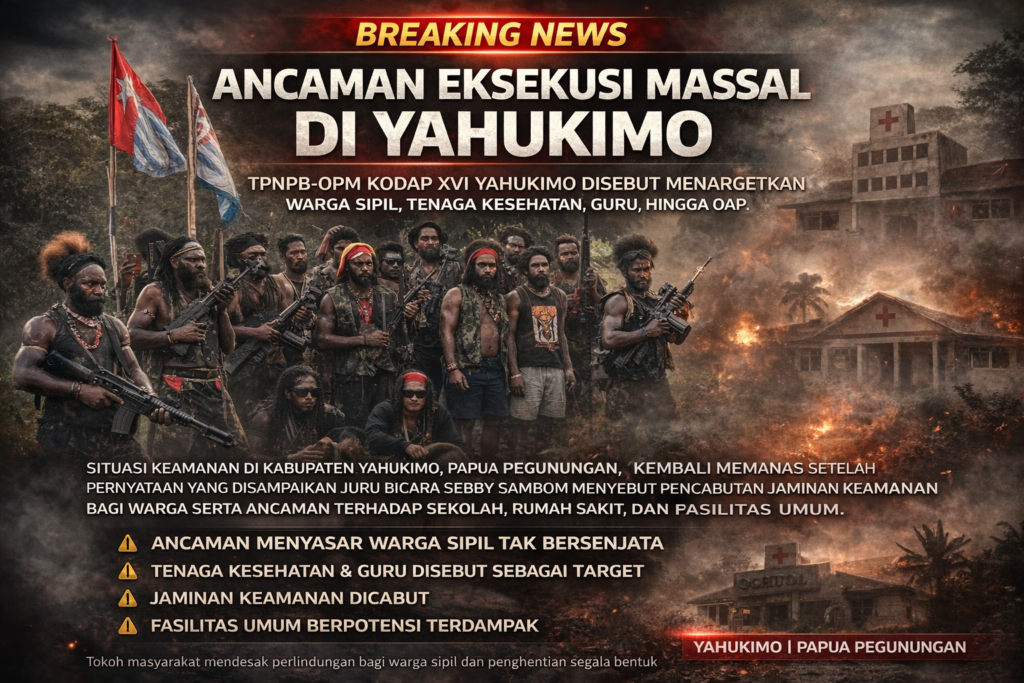 Situasi keamanan di Kabupaten Yahukimo, Papua Pegunungan, kembali memanas. Kelompok bersenjata TPNPB-OPM Kodap XVI Yahukimo kembali menunjukkan wajah brutalnya dengan mengancam akan mengeksekusi orang asli Papua (OAP), tenaga kesehatan, guru, serta pendatang di wilayah Yahukimo.