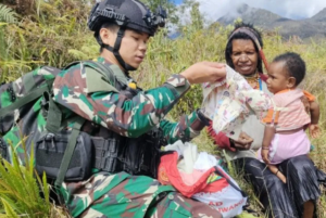 TERASTIMUR.com - Para prajurit TNI yang tergabung dalam Satuan Tugas (Satgas) Mobile Yonif Raider 300/Bjw membagikan baju untuk anak-anak di...