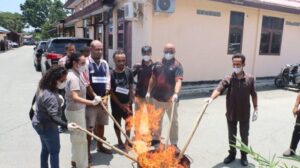 TERASTIMUR.com, SENTANI - Satuan Reserse Narkotika, Psikotropika dan Obat Berbahaya (Satresnarkoba) Polres Jayapura menggelar pemusnahan barang bukti narkotika jenis ganja di halaman Mapolres Jayapura, Doyo Baru,...