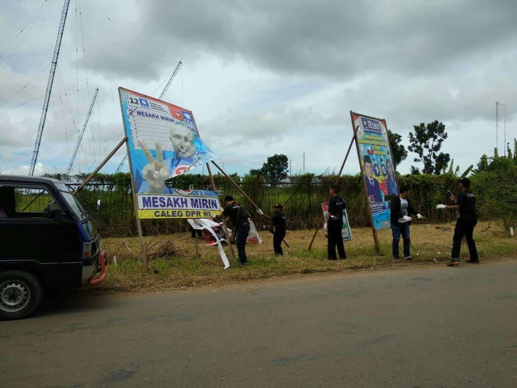 TERASTIMUR.com, MERAUKE – Badan Pengawas Pemilihan Umum (Bawaslu) Kabupaten Merauke, menertibkan ratusan Alat Peraga Kampanye (APK) yang penempatannya di luar 15 zona yang telah disepakati bersama.