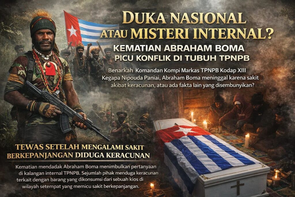 TERASTIMUR.COM – Kematian Komandan Kompi Markas TPNPB Kodap XIII Kegapa Nipouda Paniai, Abraham Boma, pada Rabu (11/2/2026) memunculkan sejumlah pertanyaan di internal organisasi. Dalam siaran pers Manajemen Markas Pusat KOMNAS TPNPB disebutkan bahwa Abraham Boma meninggal dunia setelah mengalami sakit selama enam bulan yang diduga akibat keracunan. Namun hingga kini belum ada penjelasan rinci mengenai kronologi awal kejadian, jenis zat yang diduga menjadi penyebab, maupun pemeriksaan medis yang memastikan penyebab kematiannya.