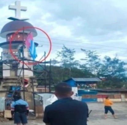 Saat masyarakat Papua merayakan HUT ke-169 Pekabaran Injil di Tanah Papua, ada onkum tidak bertanggungjawab mengibarkan bendera Bintang Kejora di Gereja Gidi, samping Tugu Salib Karubaga, Ibu Kota Kabupaten Tolikara, Provinsi Papua Pegunungan, Senin (5/2/2024).