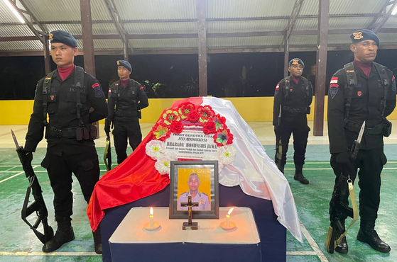 Dalam peristiwa penyerangan hingga terjadi kontak tembak, dua personel Satgas Damai Cartenz dari Brimob Polda NTT tertembak, satu diantaranya Bharada Bonifasius Jawa gugur. (tt)