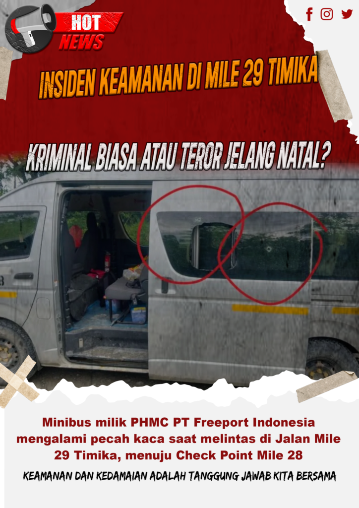TERASTIMUR.COM – Insiden pecahnya kaca minibus milik Industrial Public Health & Malaria Control (PHMC) PT Freeport Indonesia di ruas Jalan Mile 29 Timika, memunculkan tanda tanya besar terkait motif di balik aksi penyerangan tersebut, terlebih terjadi menjelang perayaan Hari Raya Natal.