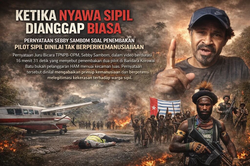 TERASTIMUR.COM – Pernyataan Juru Bicara TPNPB-OPM, Sebby Sambom, dalam video berdurasi 16 menit 31 detik yang menyebut penembakan dua pilot di Bandara Korowai Batu bukan pelanggaran HAM menuai kecaman luas. Pernyataan tersebut dinilai mengabaikan prinsip kemanusiaan dan berpotensi melegitimasi kekerasan terhadap warga sipil.