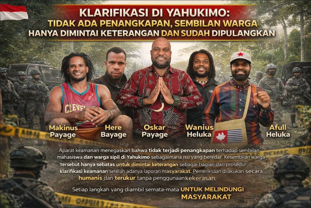 TERASTIMUR.COM – Aparat keamanan menegaskan bahwa tidak terjadi penangkapan terhadap sembilan mahasiswa dan warga sipil di Yahukimo sebagaimana isu yang beredar. Sembilan warga tersebut hanya sebatas untuk dimintai keterangan sebagai bagian dari prosedur klarifikasi keamanan setelah adanya laporan masyarakat. Pemeriksaan dilakukan secara humanis dan terukur tanpa penggunaan kekerasan.