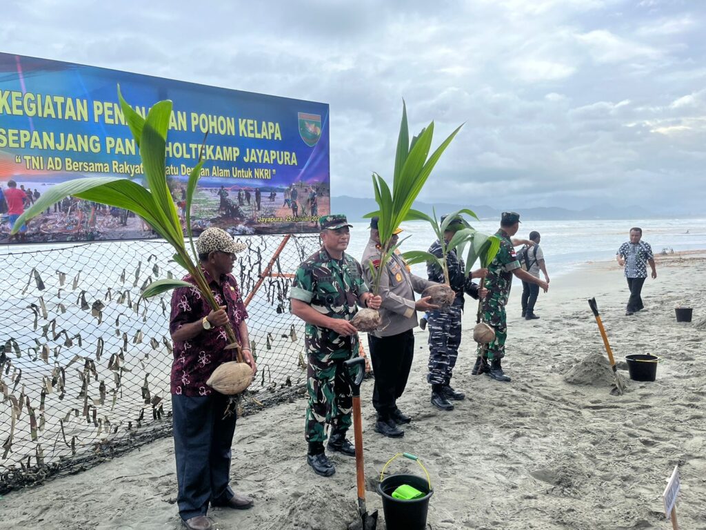 TERASTIMUR.com, JAYAPURA – Untuk mengantisipasi dan mengurangi risiko gelombang laut yang dapat menyebabkan abrasi, Pangdam XVII/Cenderawasih Mayjen TNI Izak Pangemanan dan Kapolda Papua Irjen Polisi Mathius Fakhiri memboyong masyarakat untuk aksi penanaman ribuan bibit pohon kelapa di sepanjang Pantai Holtekamp Hamadi, Kota Jayapura, Kamis (25/1/2024).