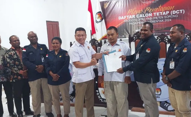 TERASTIMUR.com, SORONG – Keputusan berdasarkan rapat pleno penetapan daftar calon tetap (dct), Komisi Pemilihan Umum (KPU) Kabupaten Sorong, Papua Barat Daya resmi menetapkan daftar calon tetap (dct) bakal calon legislatif (bacaleg) anggota DPRD Kabupaten Sorong pada Pemilihan Legislatif 2024 sebanyak 320 orang di Kantor KPU setempat, Jumat.