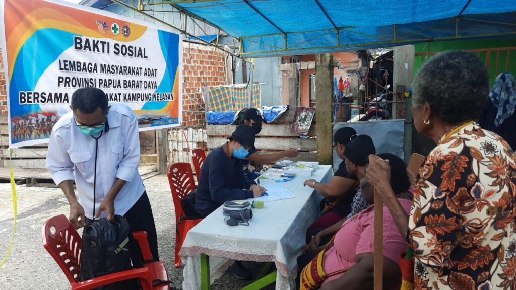 Bakti sosial dilakukan terhadap warga Kampung Nelayan Malawei di Jalan Selat Wangi, RT 05/RW 02, Kelurahan Malawei, Distrik Manoi, Kota Sorong, Senin (1/7). Dalam kegiatan tersebut, LMA bersama Puskesmas setempat memberikan pengobatan gratis dan pembagian sembako.