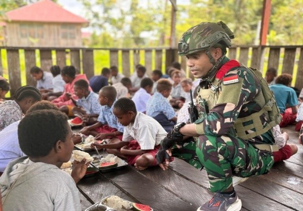 Dalam kegiatan yang dilaksanakan di Distrik Sawa Erma, Kabupaten Asmat, para prajurit membagikan makanan bergizi kepada siswa-siswi sekolah dasar sebagai langkah nyata mendukung tumbuh kembang anak-anak Papua.