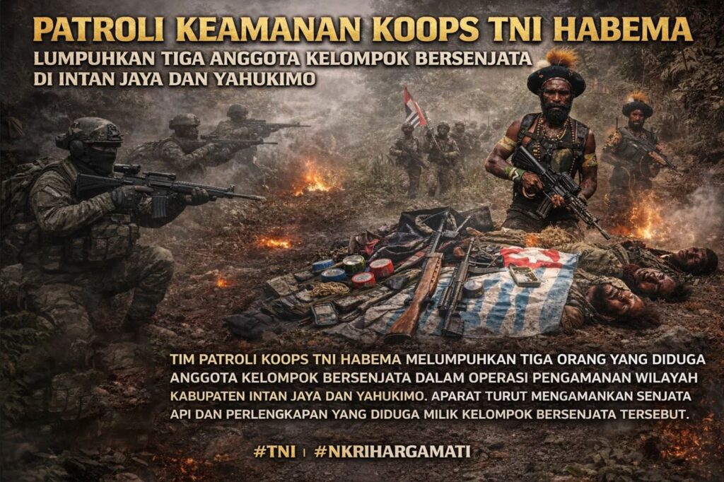 TERASTIMUR.COM – Tim patroli keamanan Koops TNI Habema melaporkan telah melumpuhkan tiga orang yang diduga merupakan anggota kelompok bersenjata dalam operasi pengamanan wilayah di Kabupaten Intan Jaya dan Yahukimo. Kegiatan tersebut merupakan bagian dari upaya menjaga stabilitas keamanan di wilayah rawan gangguan keamanan.