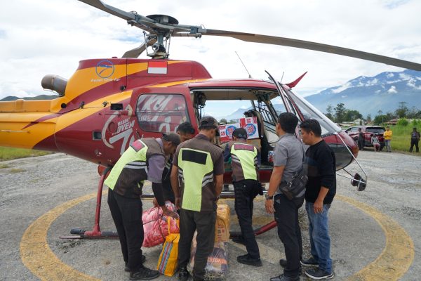 Penyaluran 10 ton beras menggunakan helikopter dari Bandara Wamena, Kabupaten Jayawijaya menuju Distrik Meborok. Pj Bupati Edison ikut terjun langsung dalam penyaluran bantuan pada Sabtu 16 Desember 2023.