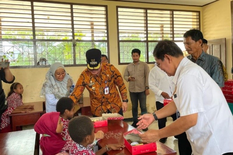TERASTIMUR.com-Pj Wali Kota Sorong, Dr. Bernhard Eduard Rondonuwu, bersama Dinas Pendidikan Kota Sorong, melaksanakan pembagian makanan bergizi gratis di SD Negeri 42 dan TK Pembina 8 Kota Sorong, Papua Barat Daya, Jumat (20/12/2024).