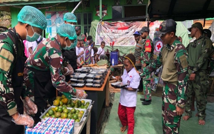 Pemberian MBG di daerah konflik itu perdana dilakukan dengan dipimpin Panglima Komando Gabungan Wilayah Pertahanan III Letnan Jenderal TNI Bambang Trisnohadi pada Senin (20/1/2025). Logistik MBG dikirim dari Timika, Mimika menggunakan Helikopter Caracal TNI AU.