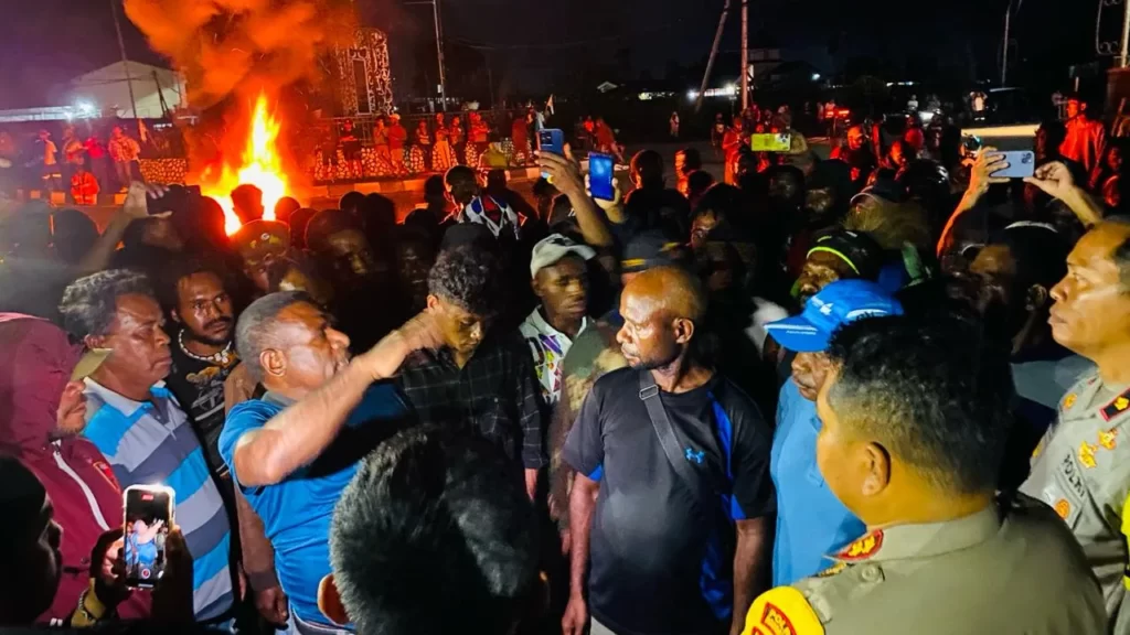 TERASTIMUR.com, TIMIKA – Puluhan warga melakukan aksi protes dengan membakar ban di depan Gedung Eme Neme Yauware, Kamis (7/3/2024) sekitar pukul 02:00 dini hari.