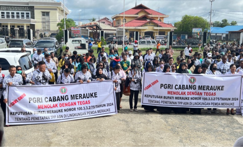 Para guru mengenakan seragam PGRI menggelar aksi unjuk rasa di halaman kantor, Mereka membentangkan spanduk bertuliskan “PGRI Cabang Merauke Menolak dengan Tegas Keputusan Bupati Merauke Nomor 100. 332/75 Tahun 2024 tentang Penetapan TPP ASN di Lingkungan Pemkab Merauke.”