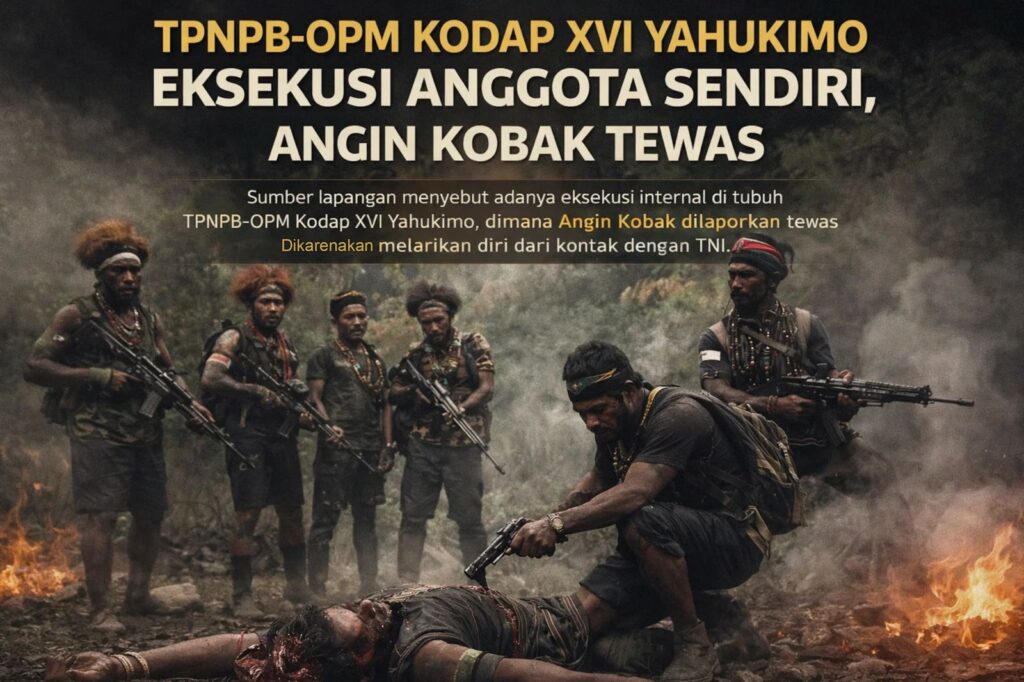 Sumber-sumber lapangan mengungkap terjadinya eksekusi internal di tubuh TPNPB-OPM Kodap XVI Yahukimo. Seorang anggota bernama Angin Kobak dilaporkan tewas setelah dituduh “kabur” dan tidak berani menghadapi kontak dengan TNI. Insiden ini menambah daftar panjang konflik internal yang disebut-sebut kerap disembunyikan dari publik.