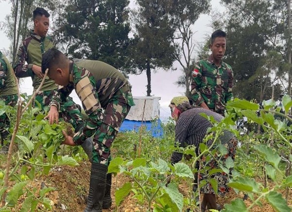 TERASTIMUR.com-Satuan Tugas (Satgas) Yonif 521/DY bergotong-royong membantu memanen hasil kebun masyarakat Distrik Napua, Kabupaten Jayawijaya, Papua Pegunungan sebagai wujud komunikasi sosial di wilayah penugasan.