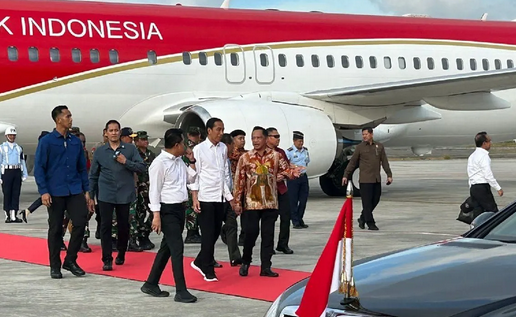 Kedatangan Presiden Jokowi di Bandara Frans Kaisiepo Biak disambut Mendagri Tito Karnavian bersama forkompinda dan pimpinan satuan TNI/Polri.